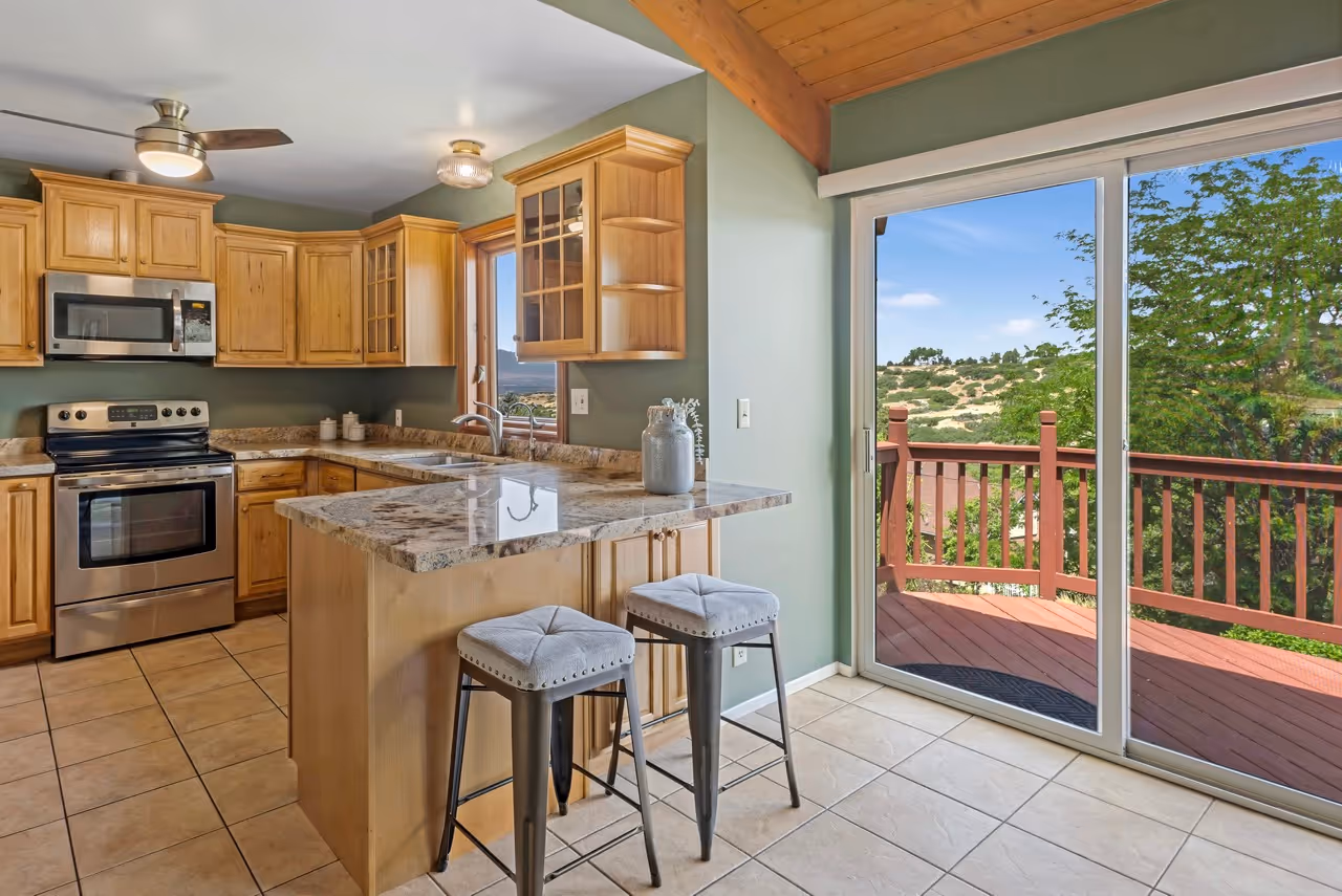 Large windows spans nearly the entire back of the home on this level allowing you to take in the magnificent valley sunsets and the open space of the nearby Dimple Dell Regional Park where you will find over 15 miles of multi‑use soft-surface trails ideal for hiking, biking, and horseback riding. Two large sliding doors opens onto the expansive deck complete with newer hot tub that will be staying for the new homeowners to take in the nearly 180 degree views.