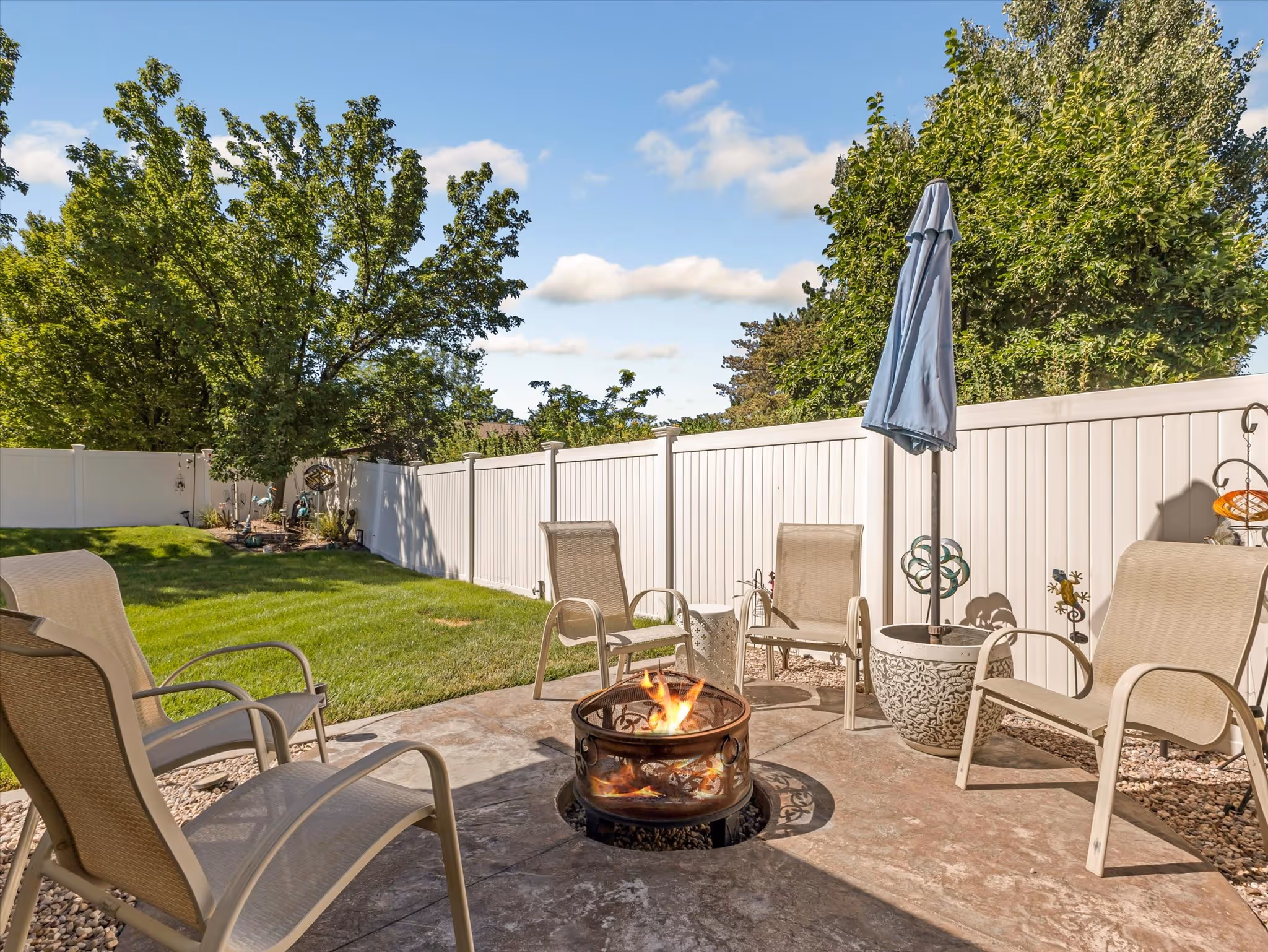 Smart home features like a Ring doorbell and smart thermostat enhance daily living. Outside, be wowed by the expansive yard, featuring mature trees, ample parking for 9+ vehicles (front and back), and a full-length covered back patio, complete with ceiling fans for summer comfort and space for propane heaters in winter. The stamped concrete patio is repeated in a separate cozy fire pit area, creating another place to retreat to and gather with friends.